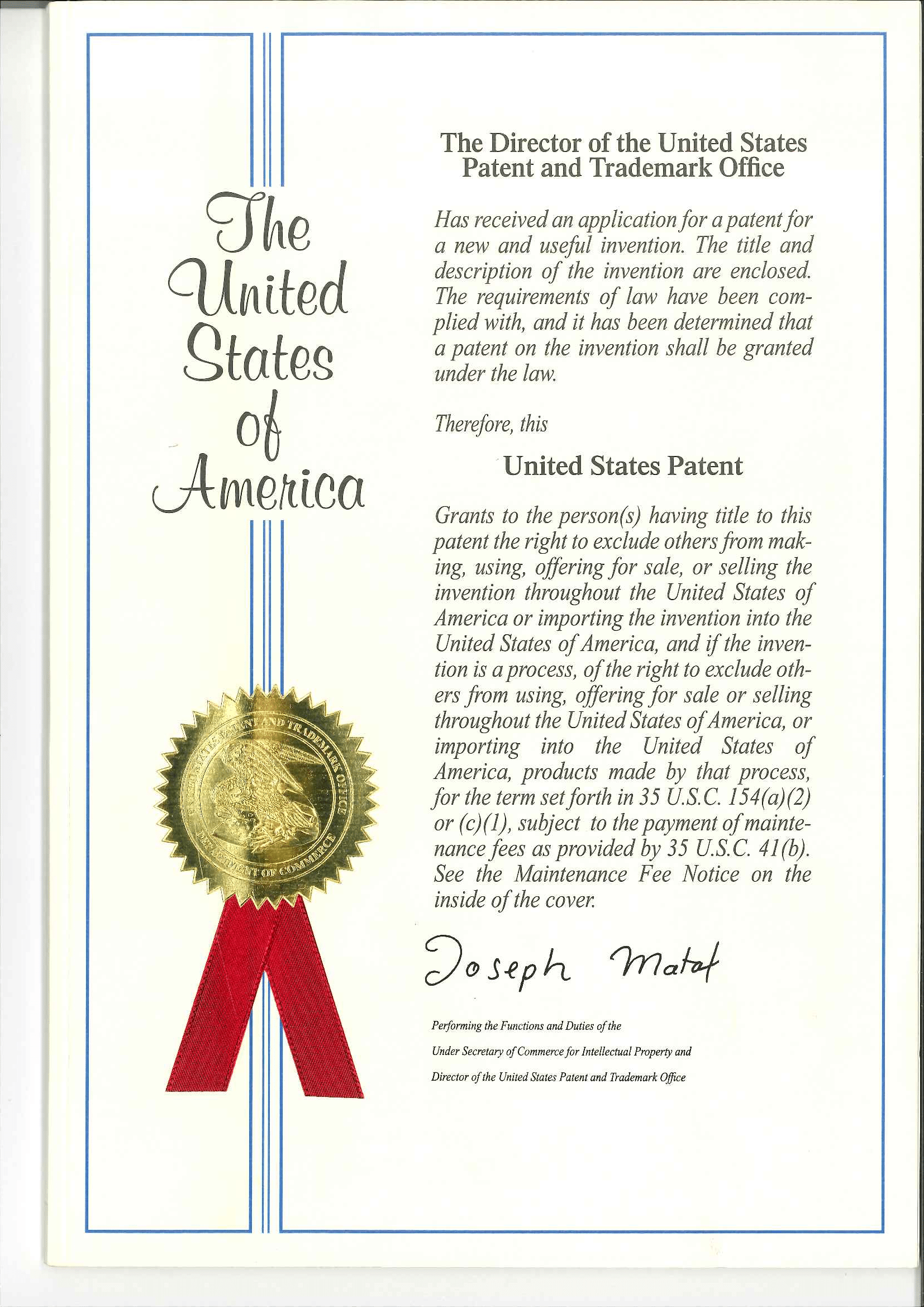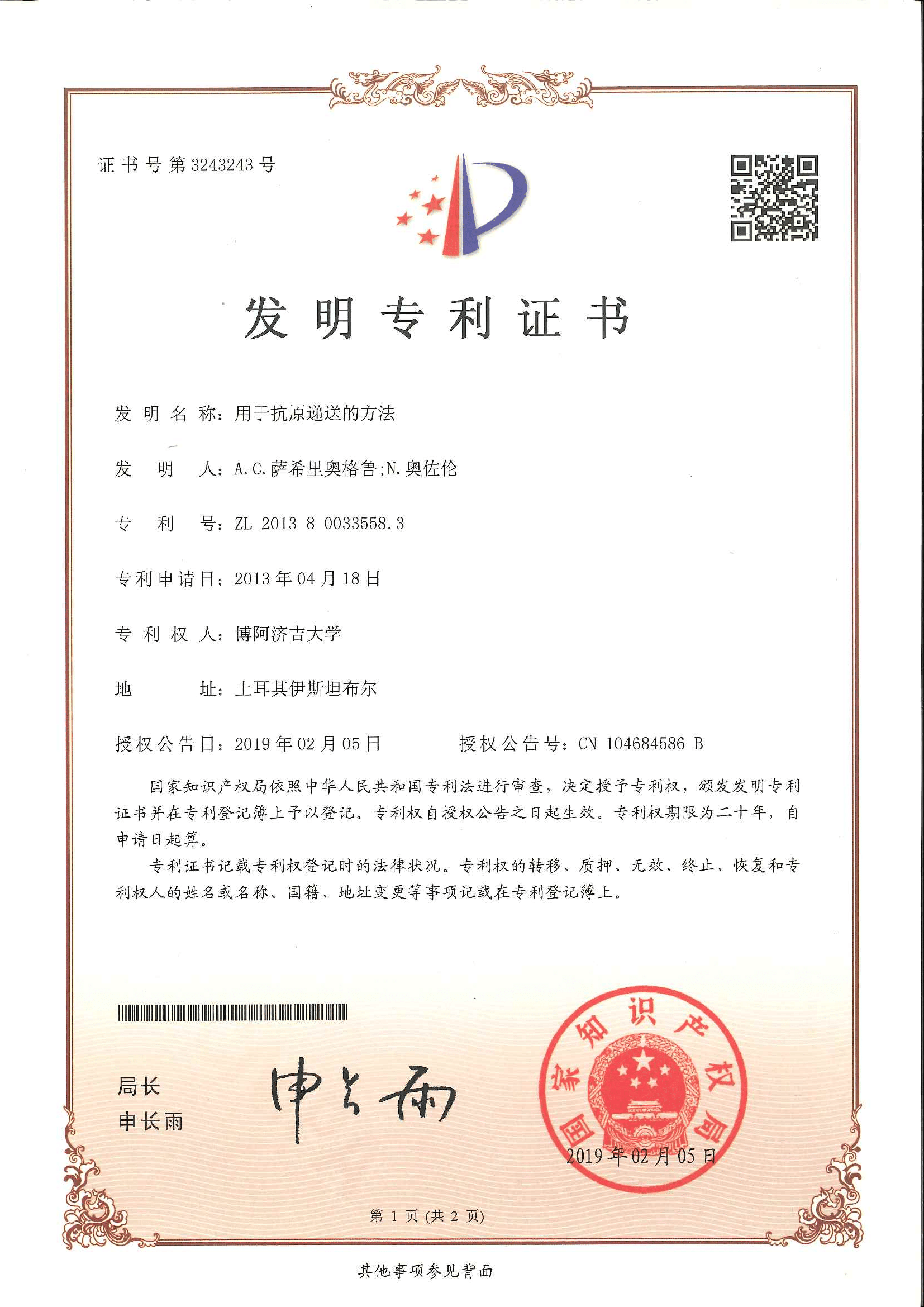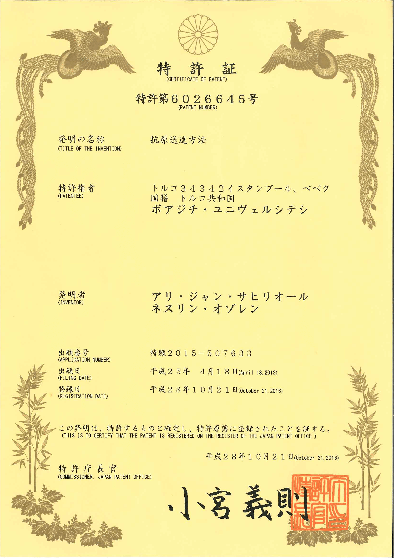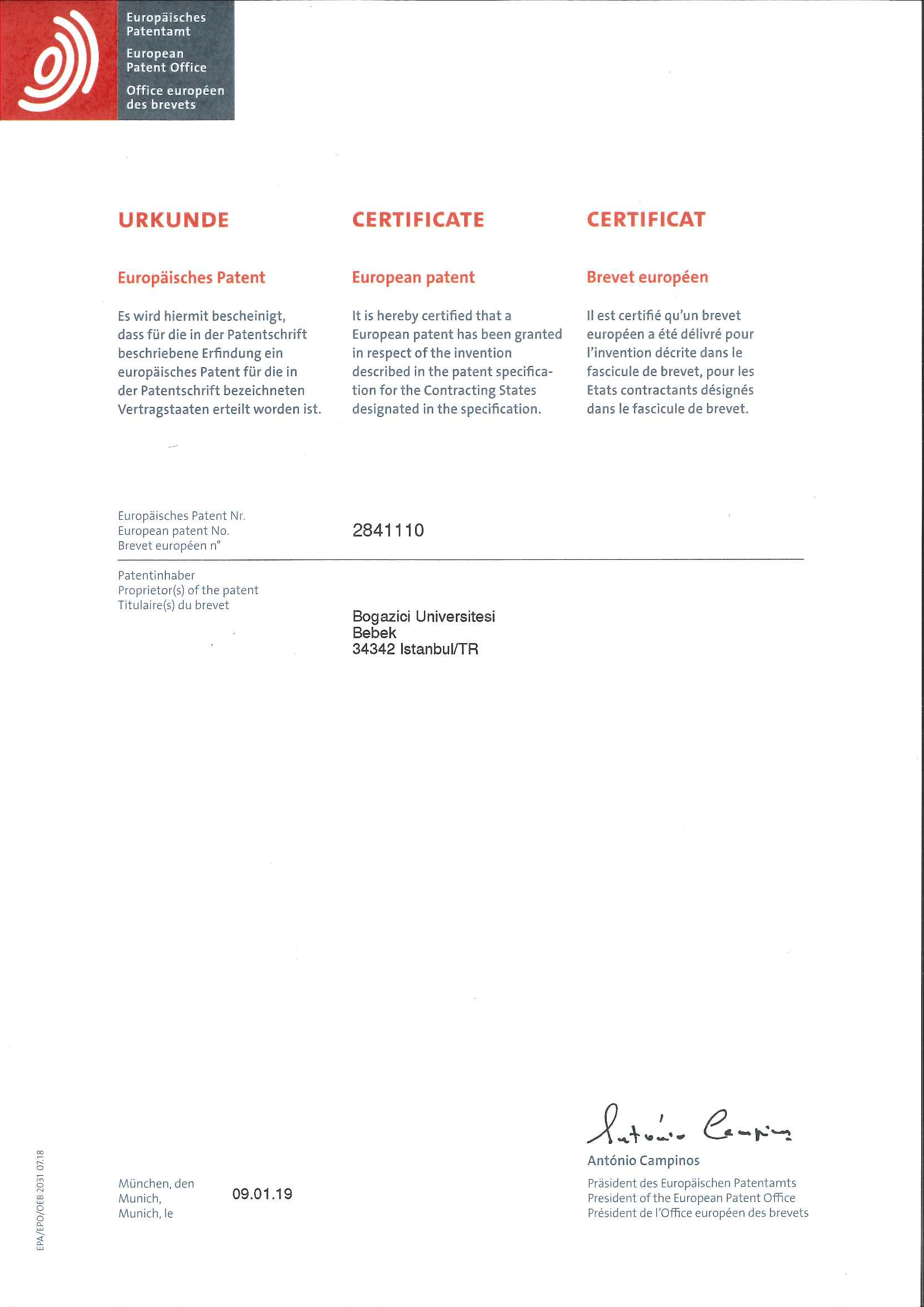 Avrupa’dan aldığımız patent sertifikası – 2019